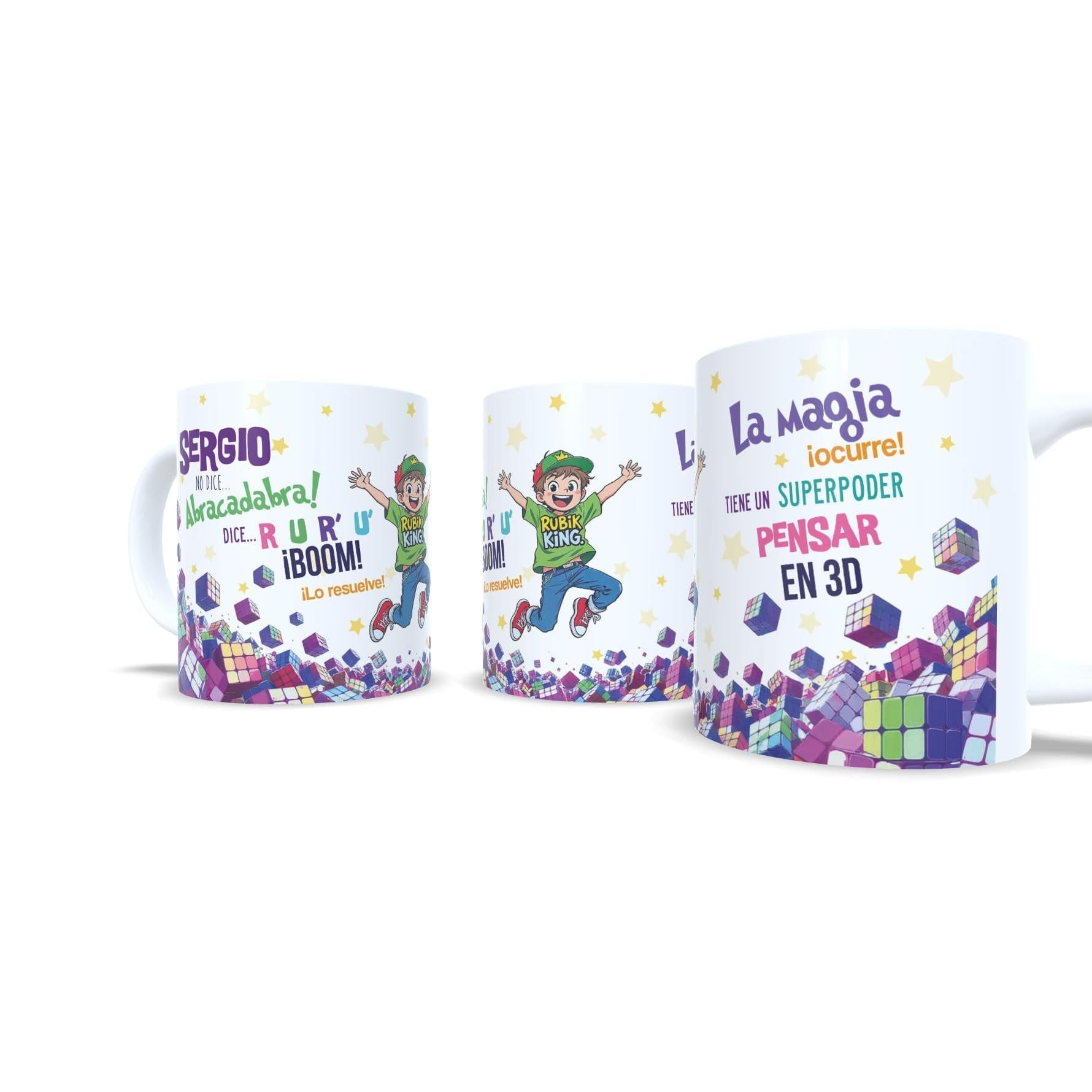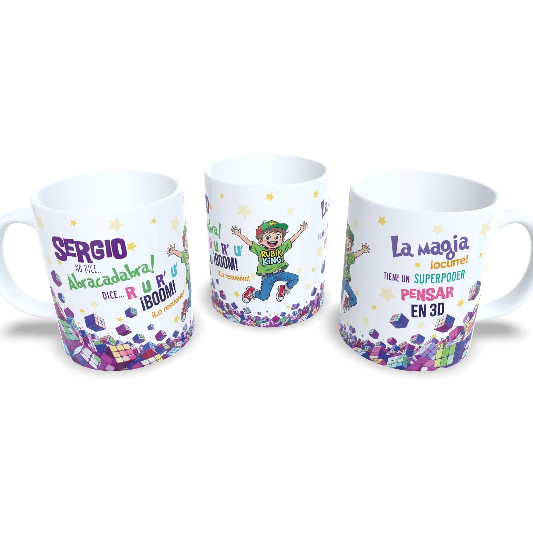 Para ese niño que no se rinde hasta resolver el cubo 🟪🟧🟩. Esta taza Rubik King muestra un niño con su cubo Rubik y camiseta “Rubik King”, rodeado de colores vibrantes. Personalízala con su nombre y conviértela en un regalo único para cumpleaños, logros escolares o motivación diaria.