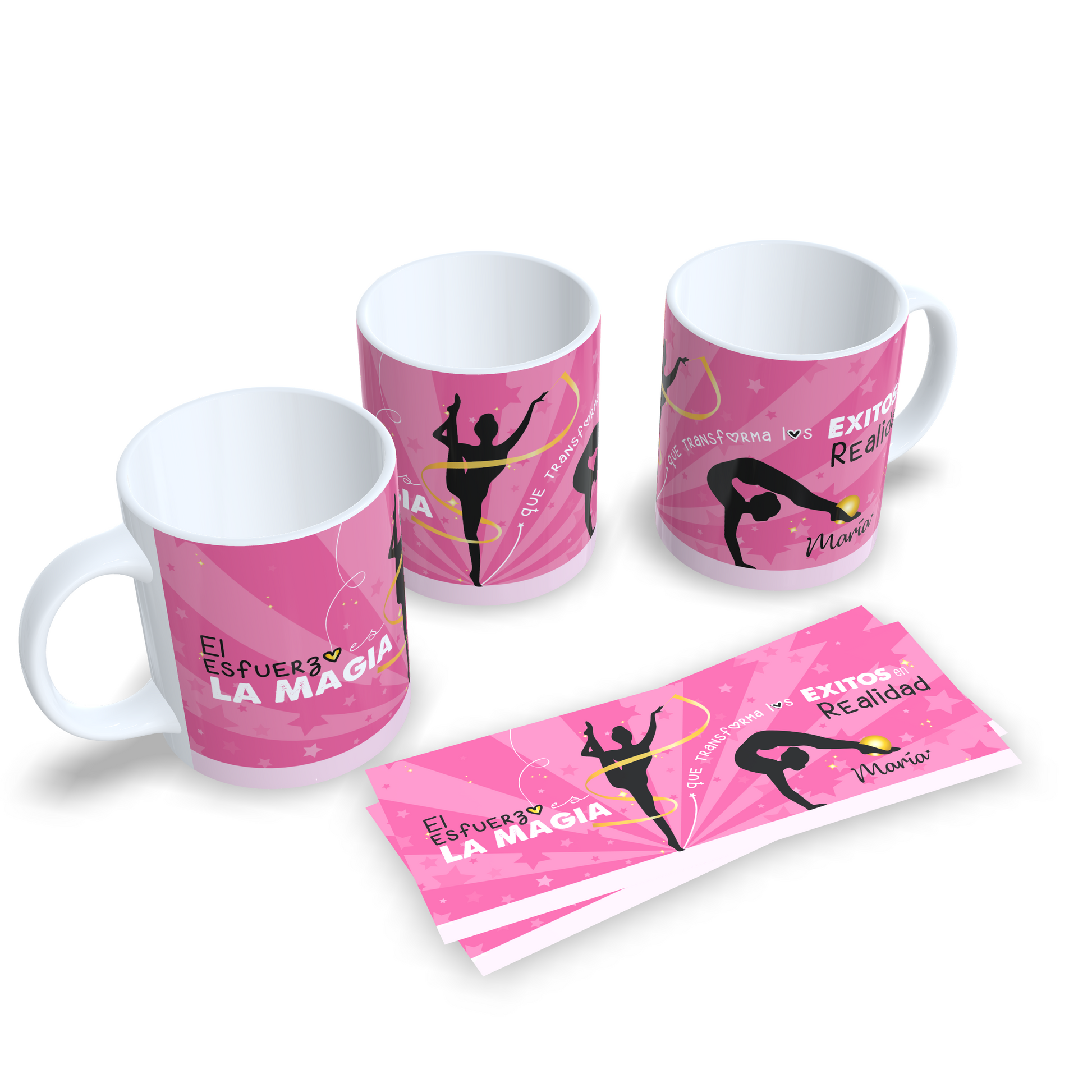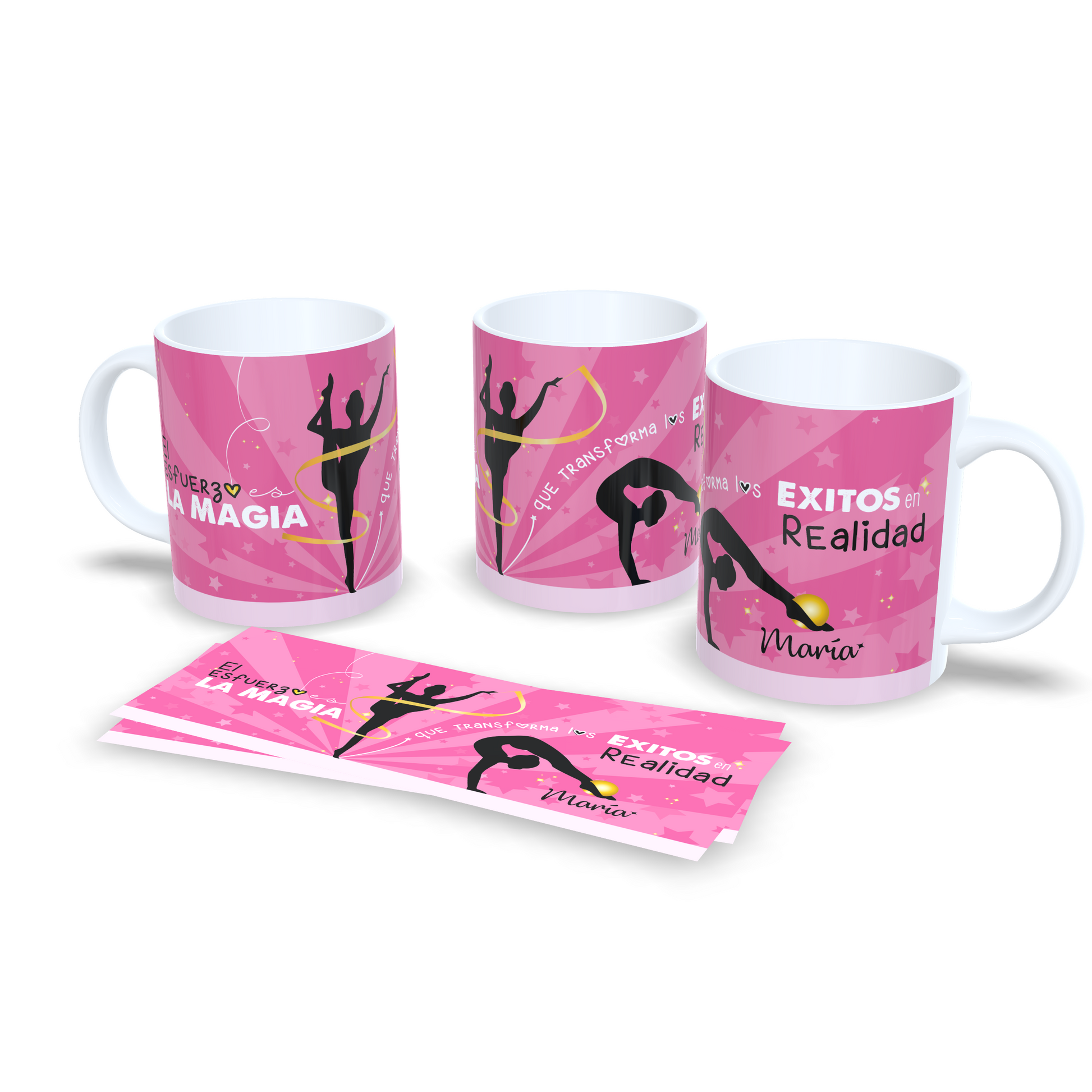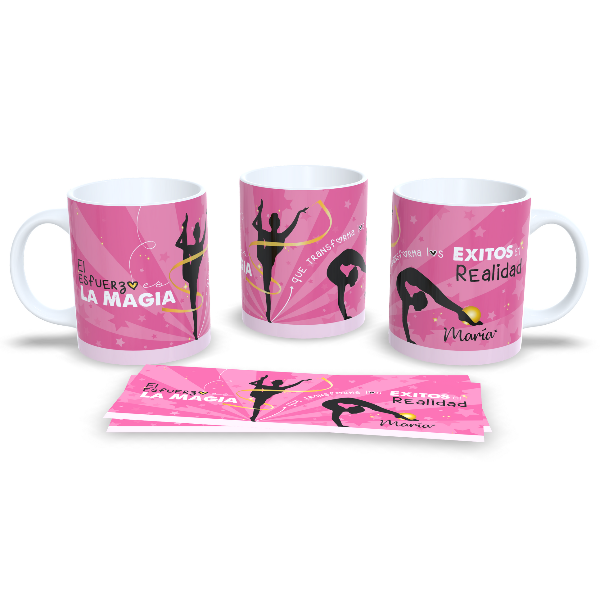 Personaliza con el nombre y disfruta de esta taza colorida llena de estilo. Perfecta para gimnastas y entrenadoras que aman la gimnasia rítmica.