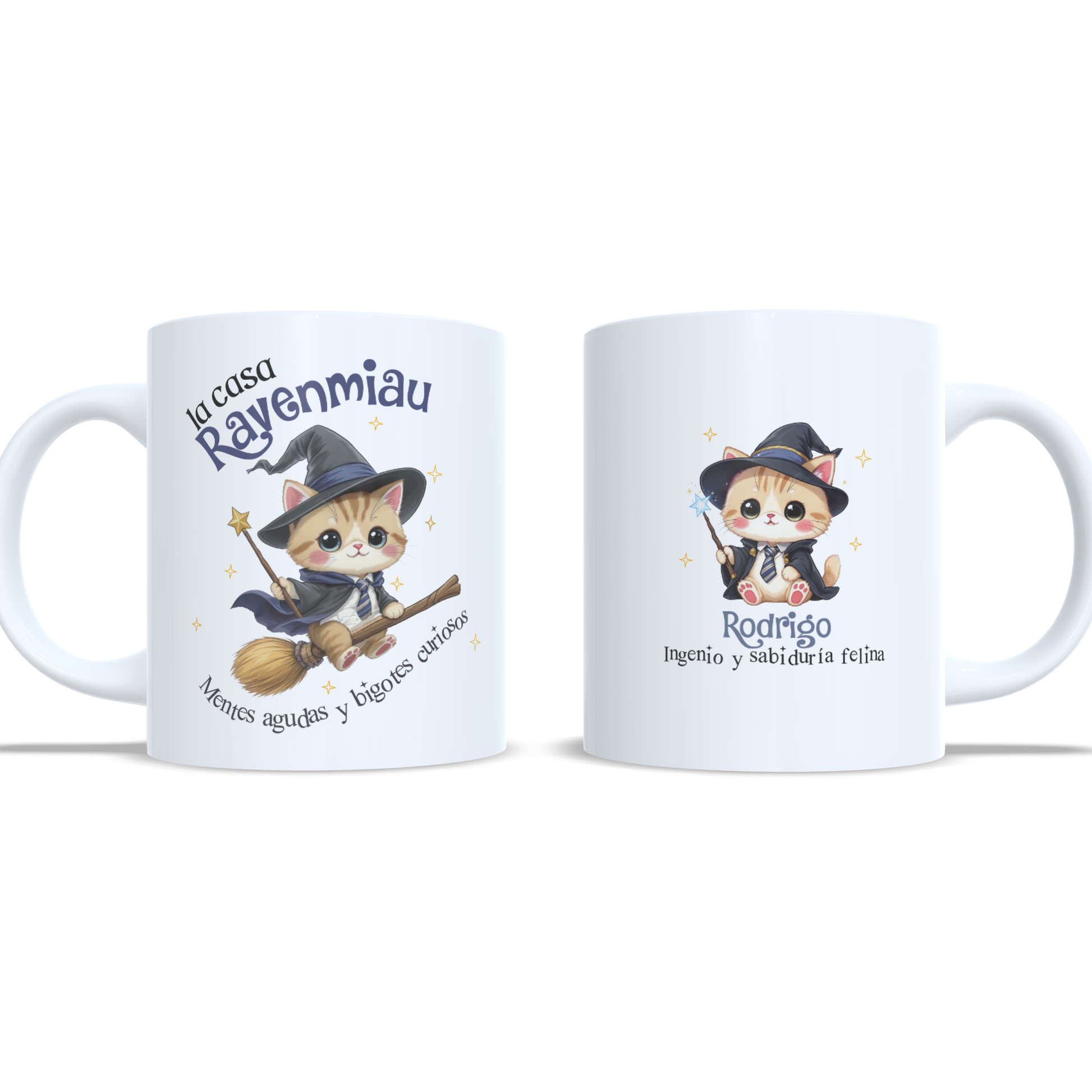 Si lo tuyo es la sabiduría, la creatividad y un toque felino, esta taza es para ti. Con un gatito kawaii vestido con los colores azul y bronce de la casa Ravenmiau, convierte cada café o té en un momento mágico. Personalízala con el nombre que quieras y crea un regalo único para cualquier fan de Hogwarts y los gatos.