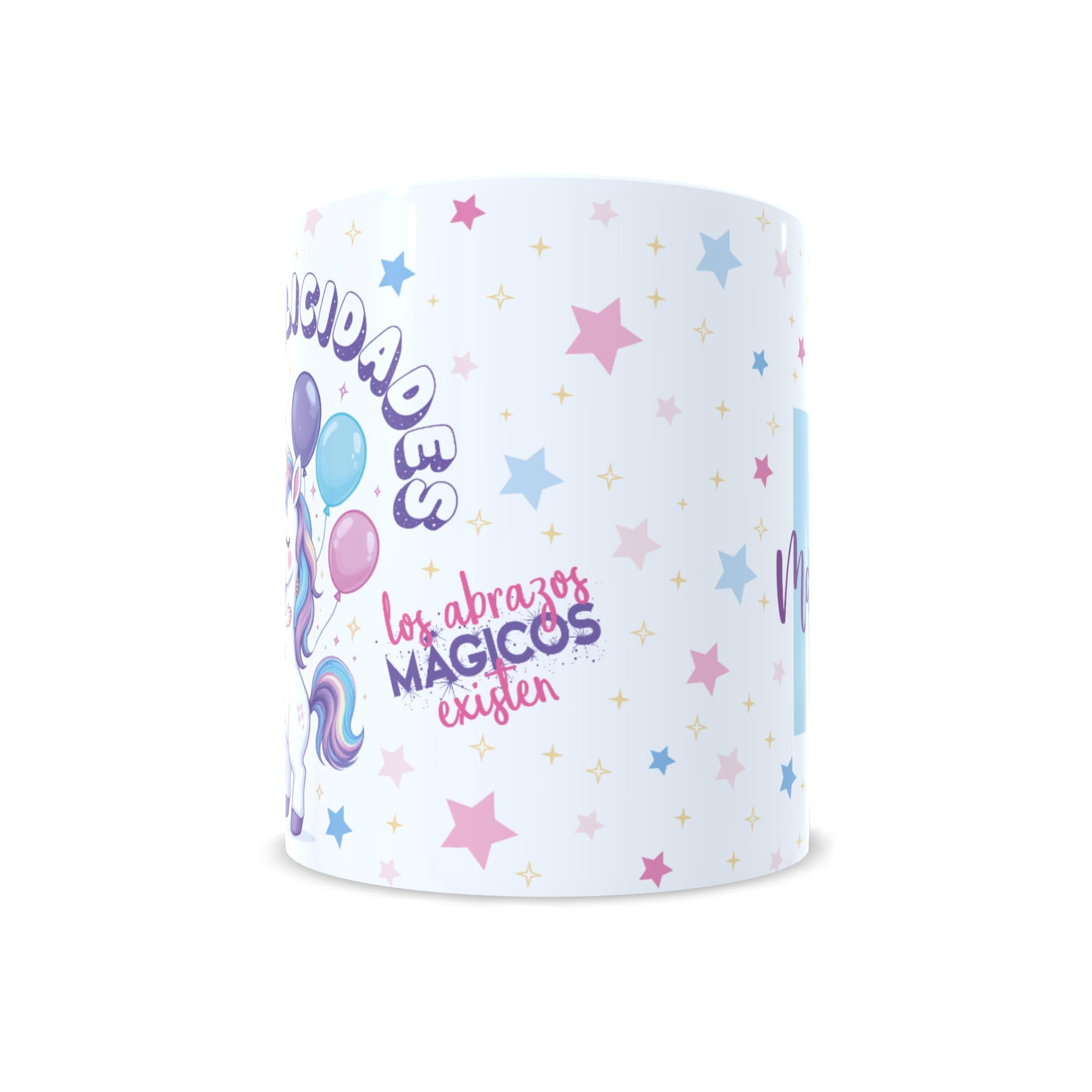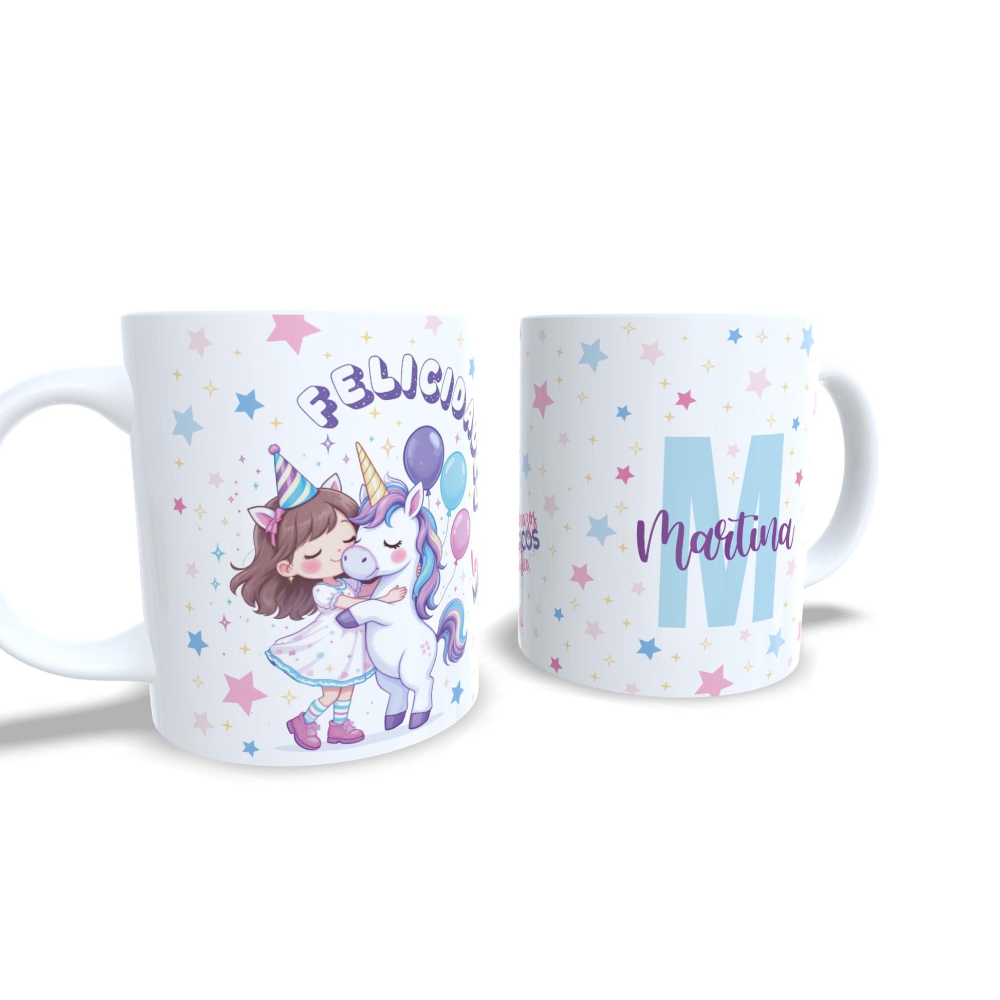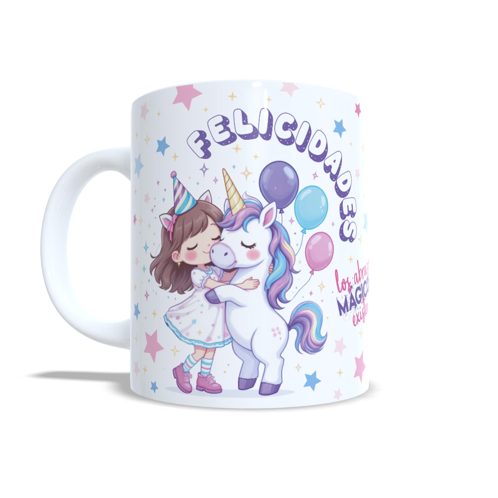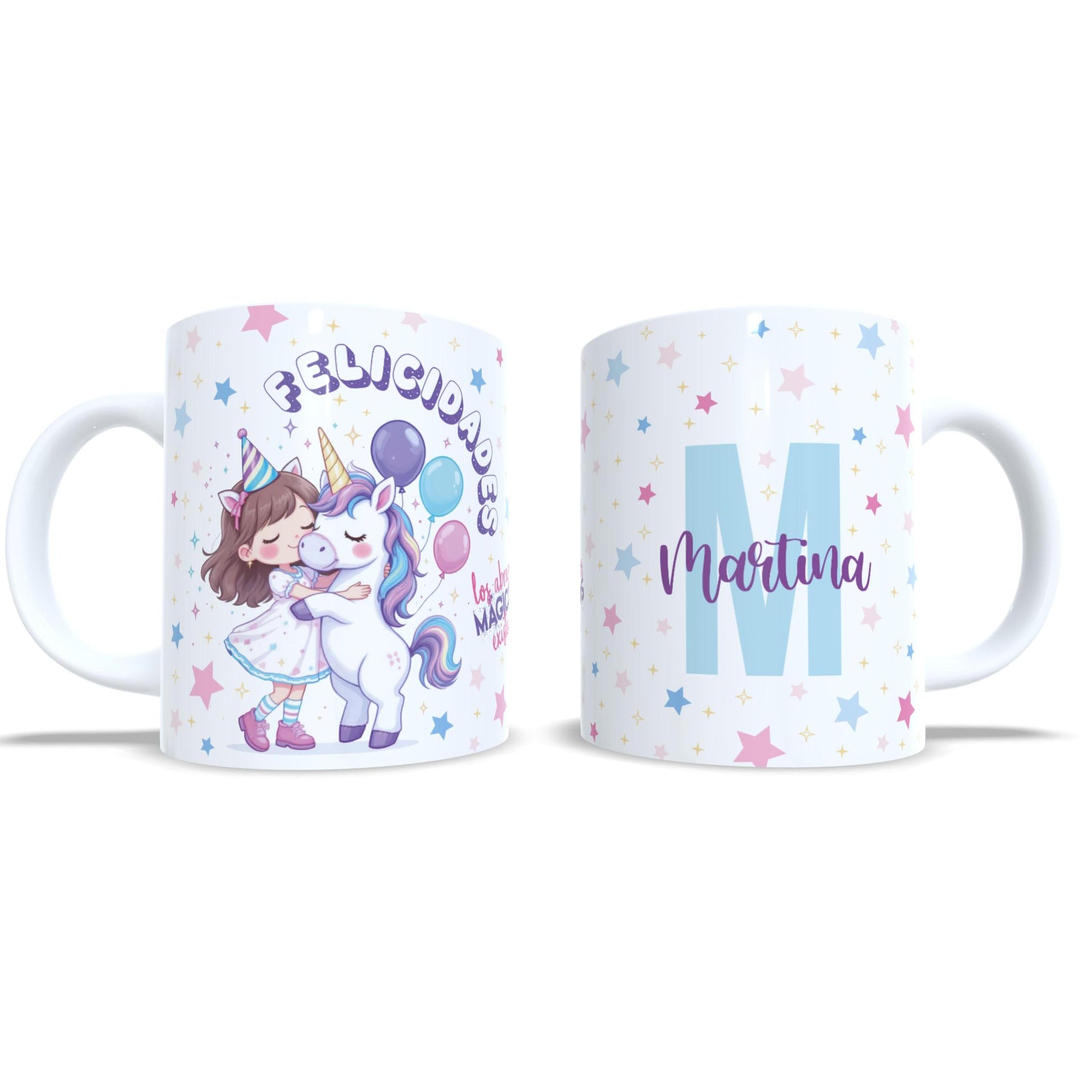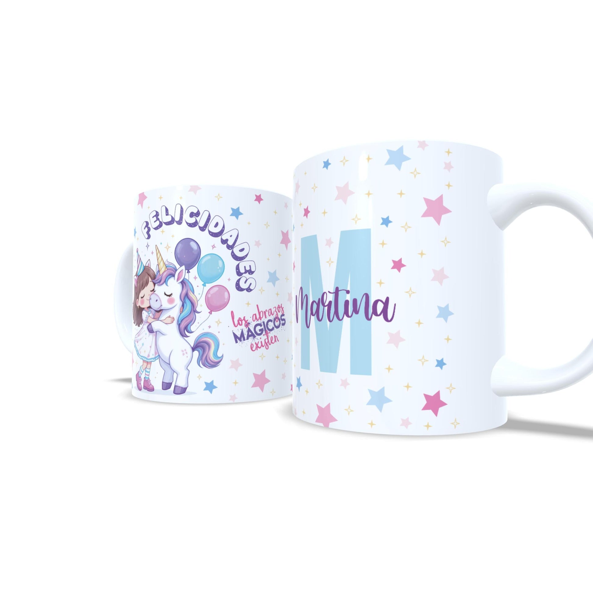 Descubre la ternura hecha taza con nuestra taza infantil personalizada en la que un unicornio lleno de magia abraza a una niña. Con el mensaje encantador "Los abrazos mágicos existen", esta taza se convierte en el regalo perfecto para niñas soñadoras que creen en la fantasía, la amistad y los colores bonitos. Cada taza se personaliza con el nombre y la inicial de la niña, lo que la convierte en un detalle único y especial para cumpleaños, celebraciones o simplemente para recordarle lo especial que es cada día. La ilustración colorida y dulce está diseñada para enamorar desde el primer vistazo. Esta taza no solo acompaña los desayunos, sino también los momentos de imaginación y ternura. Ideal para regalar a tu hija, sobrina, nieta o a una pequeña amiga con alma de arcoíris.