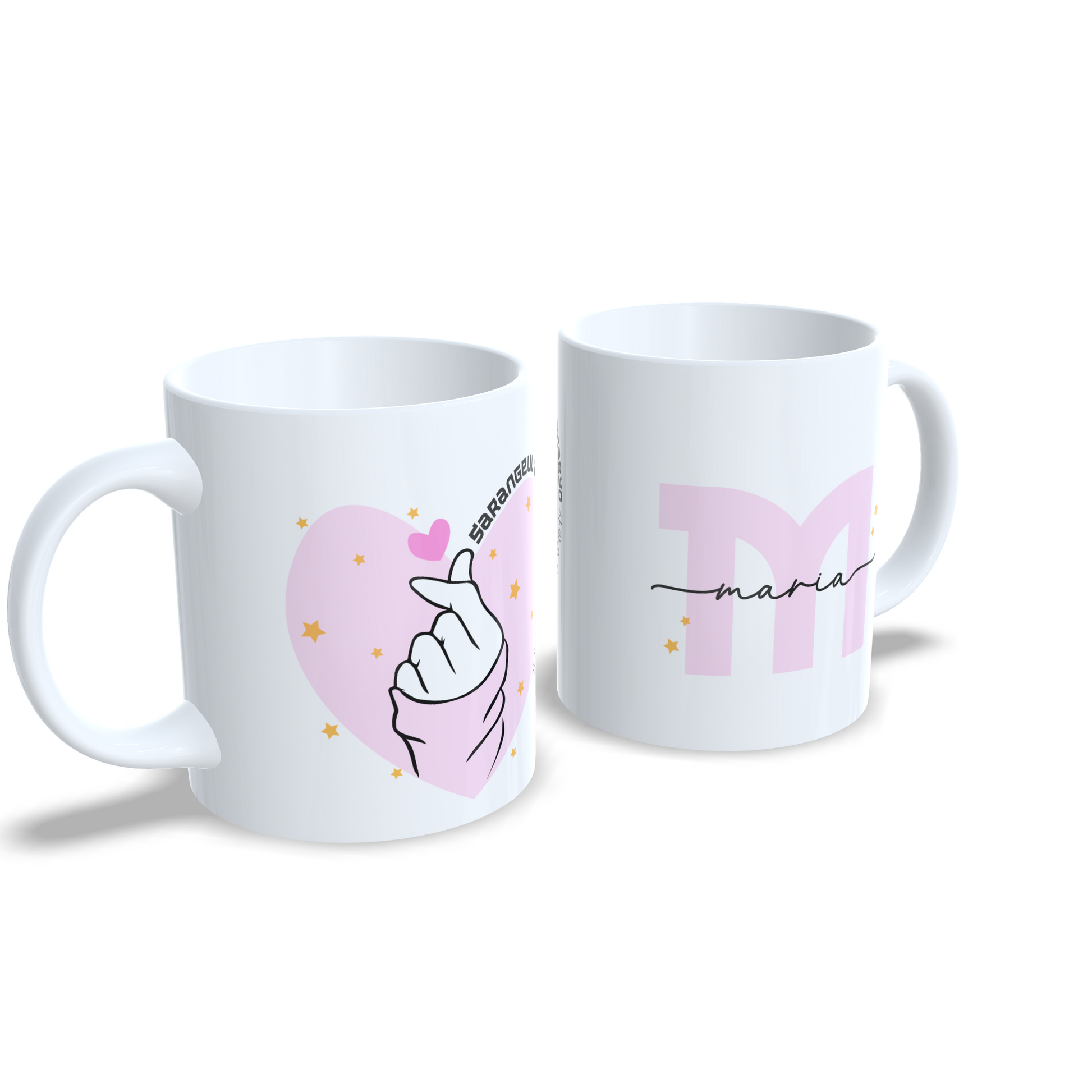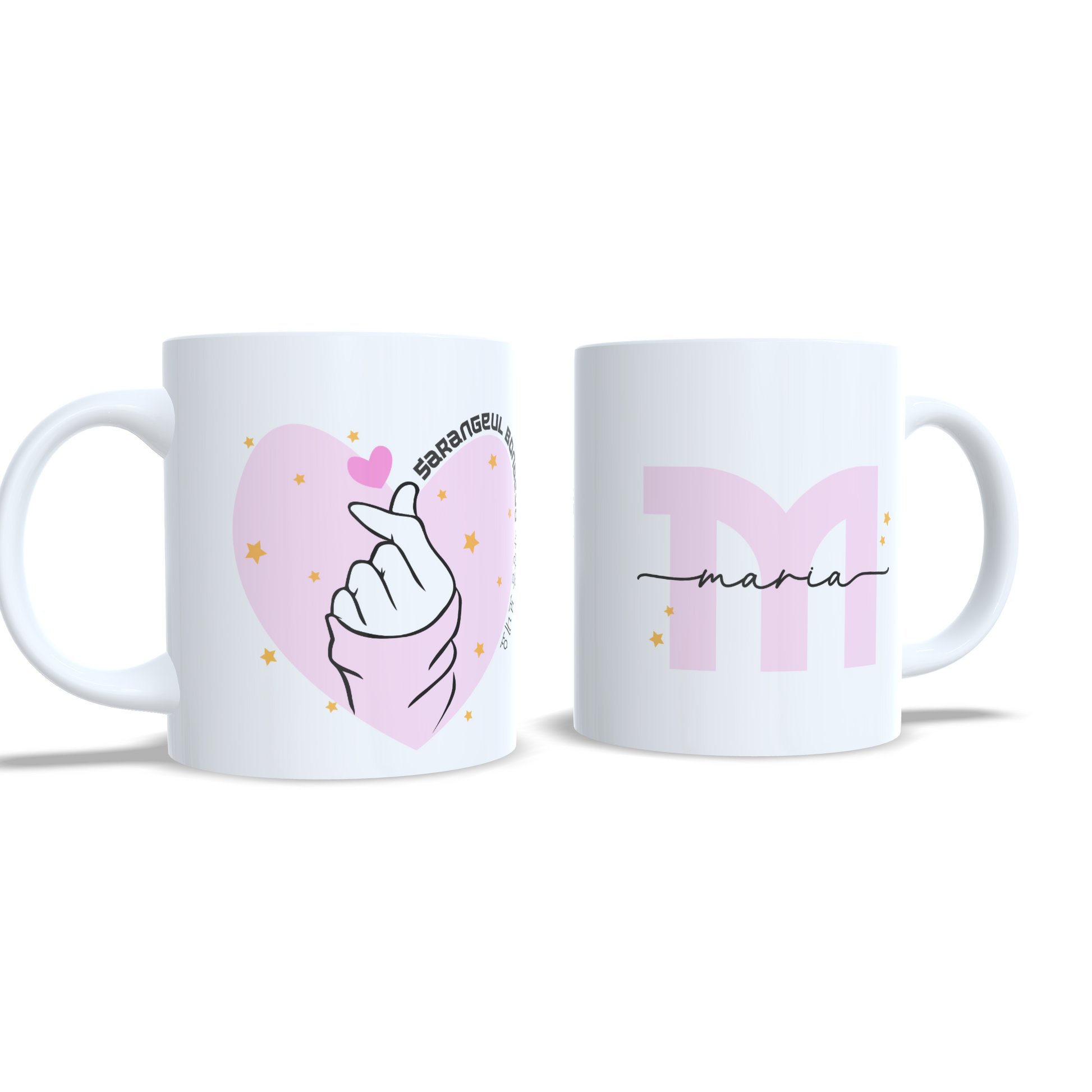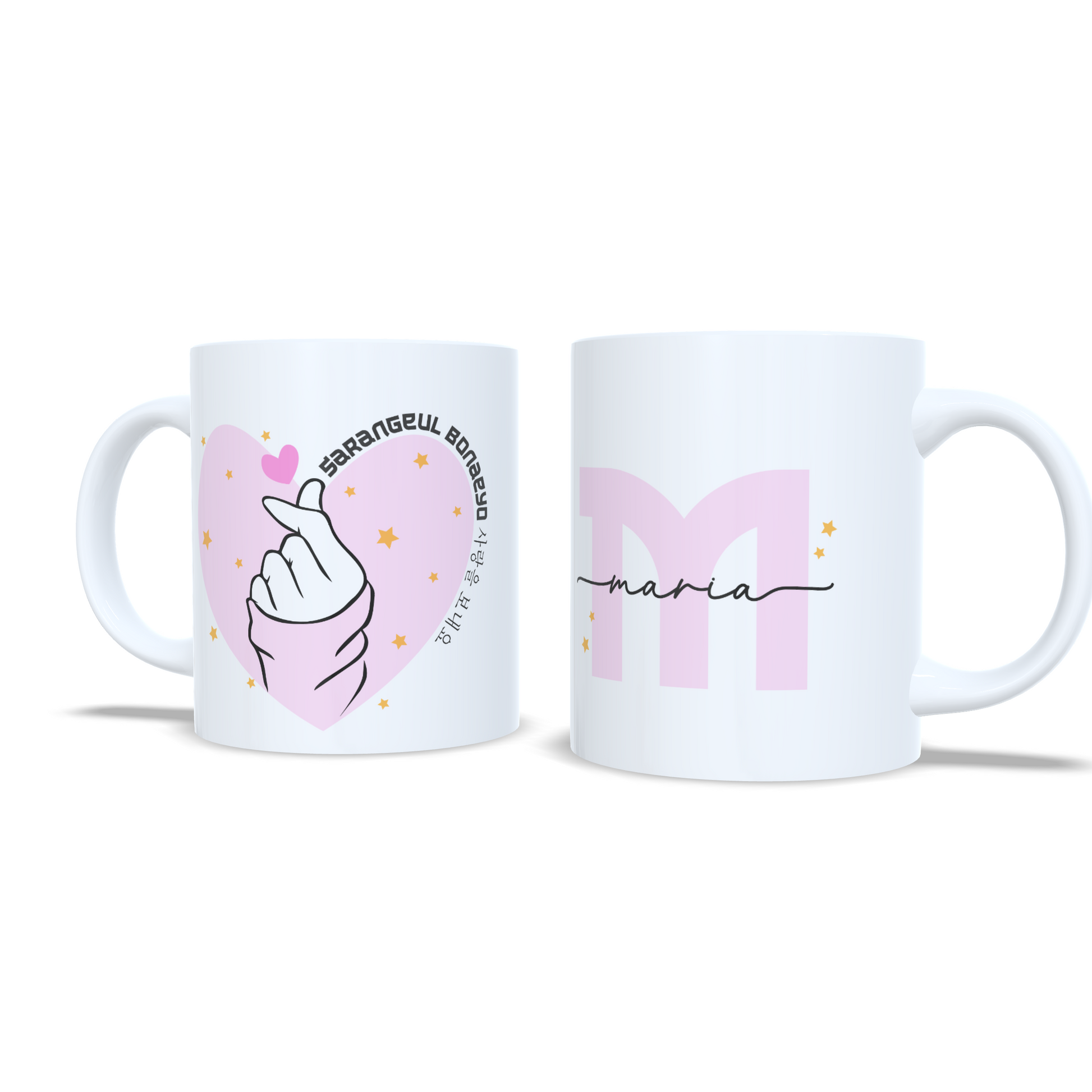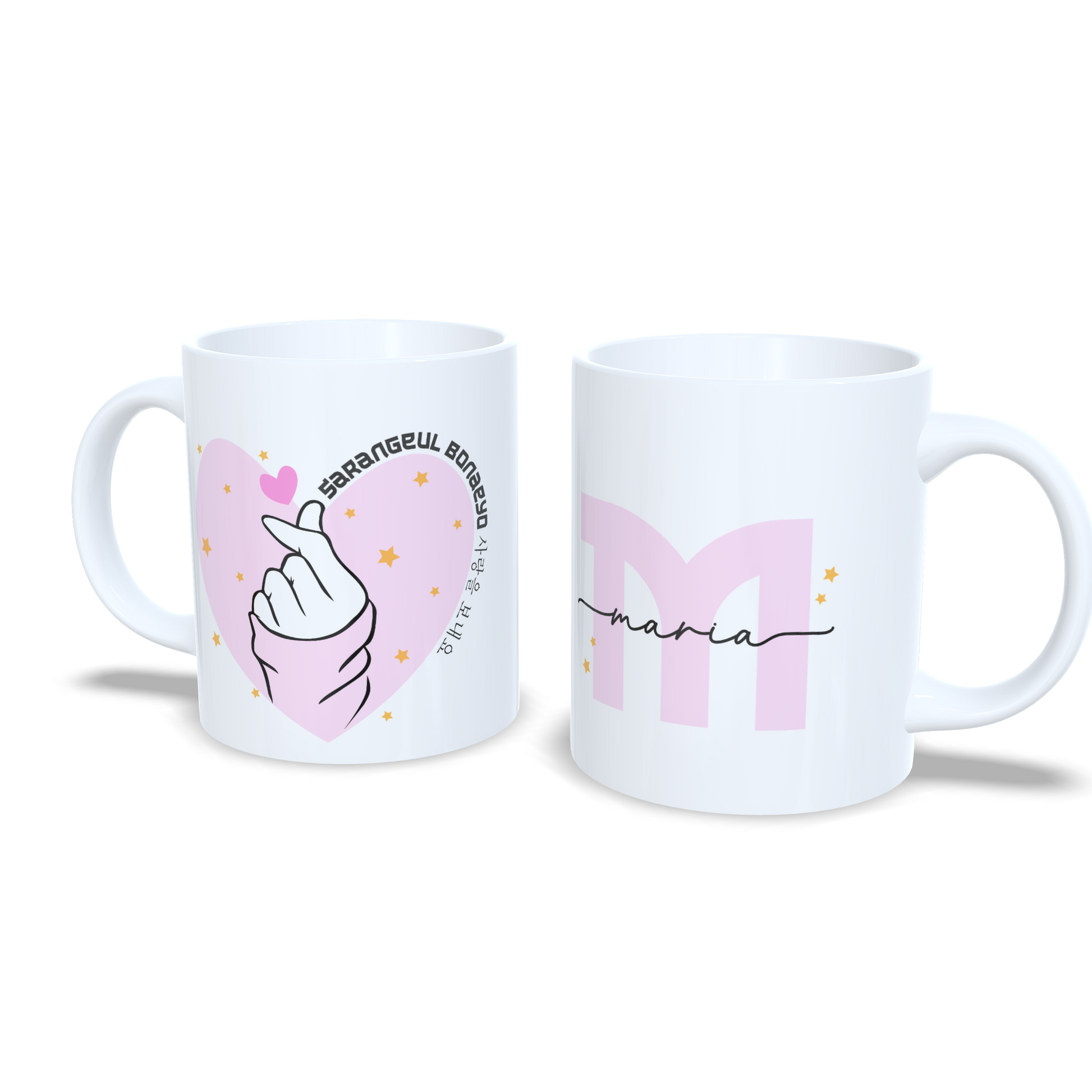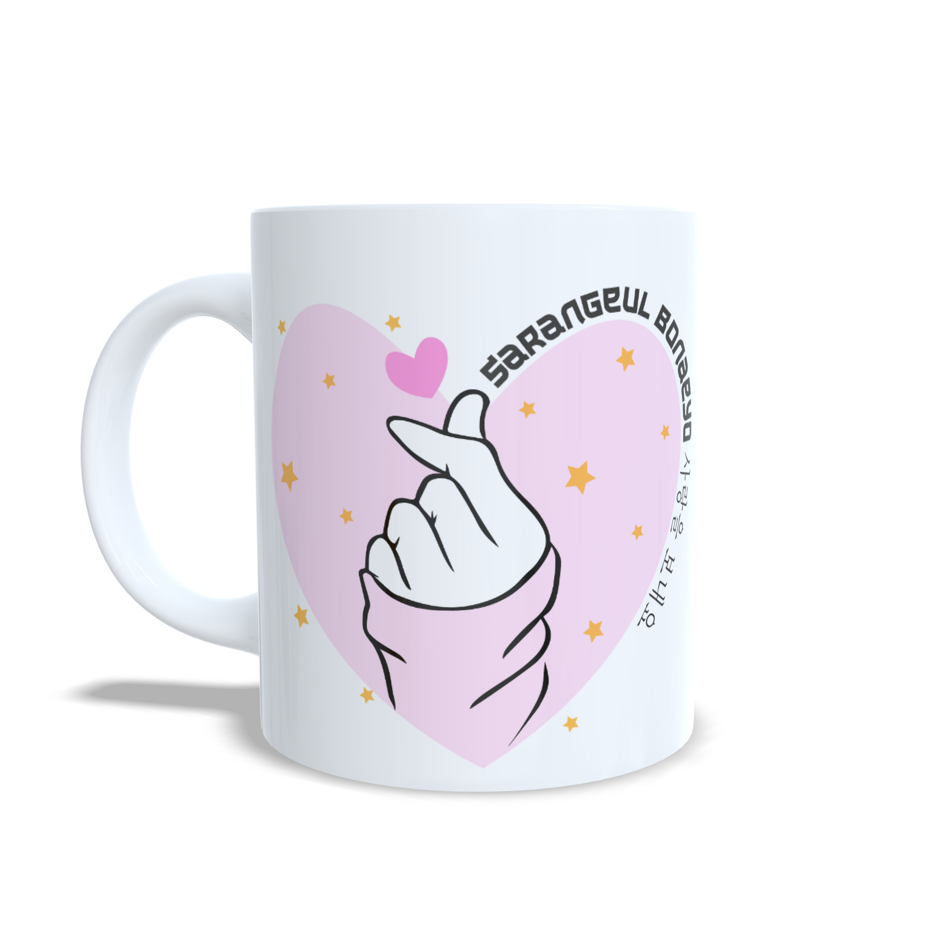 Sorprende con un detalle único y lleno de ternura con esta preciosa taza personalizada con el mensaje “Sarangeul Bonaeyo” (Te envío amor). Su diseño incluye el símbolo coreano de los dedos en forma de corazón, acompañado de un gran corazón central que transmite cariño y dulzura.