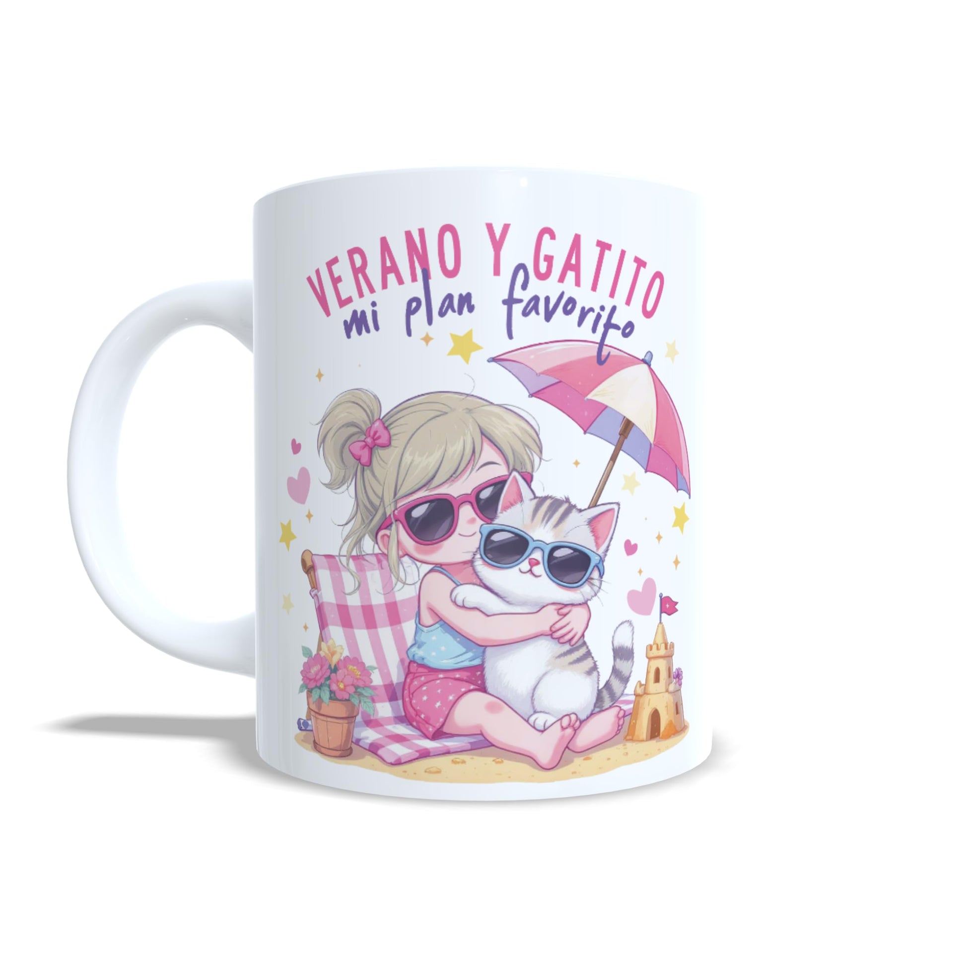 Disfruta del verano con la compañía más dulce: una niña rubia y su gatito compartiendo un abrazo en la playa. Esta taza infantil personalizada captura esos momentos mágicos con el mensaje alegre: “Verano y gatito, mi plan favorito”. Diseñada con un aire veraniego encantador, esta taza es ideal para niñas amantes de los gatos y de los días soleados. Además, puedes personalizarla con el nombre de la niña y del gatito, creando un recuerdo tierno, único y especial. Perfecta para cumpleaños de verano, vacaciones, detalles sorpresa o como taza de uso diario para empezar el día con una sonrisa felina y soleada.